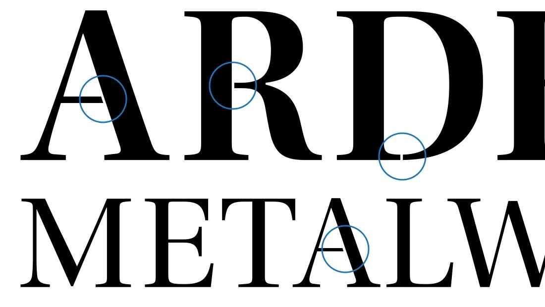 To solve this, the logo needed to be designed in a manner that facilitated CNC reproduction. The typeface, however, was another issue. Since the new company name, Ardent Metalworks, included the enclosed letters A, R, D and O, a solution was needed. Rather than create one logo with stencil-like letters for the CNC machine, two versions were developed. The first was used for screen and print applications. It featured the letters as they typically appear, with an enclosed A, R, D and O. A second version was created with cuts in the letters to allow the CNC machine to pass through and cut out the inside of the enclosed letters. This version is seen below with the cuts in the letter shapes circled in blue.